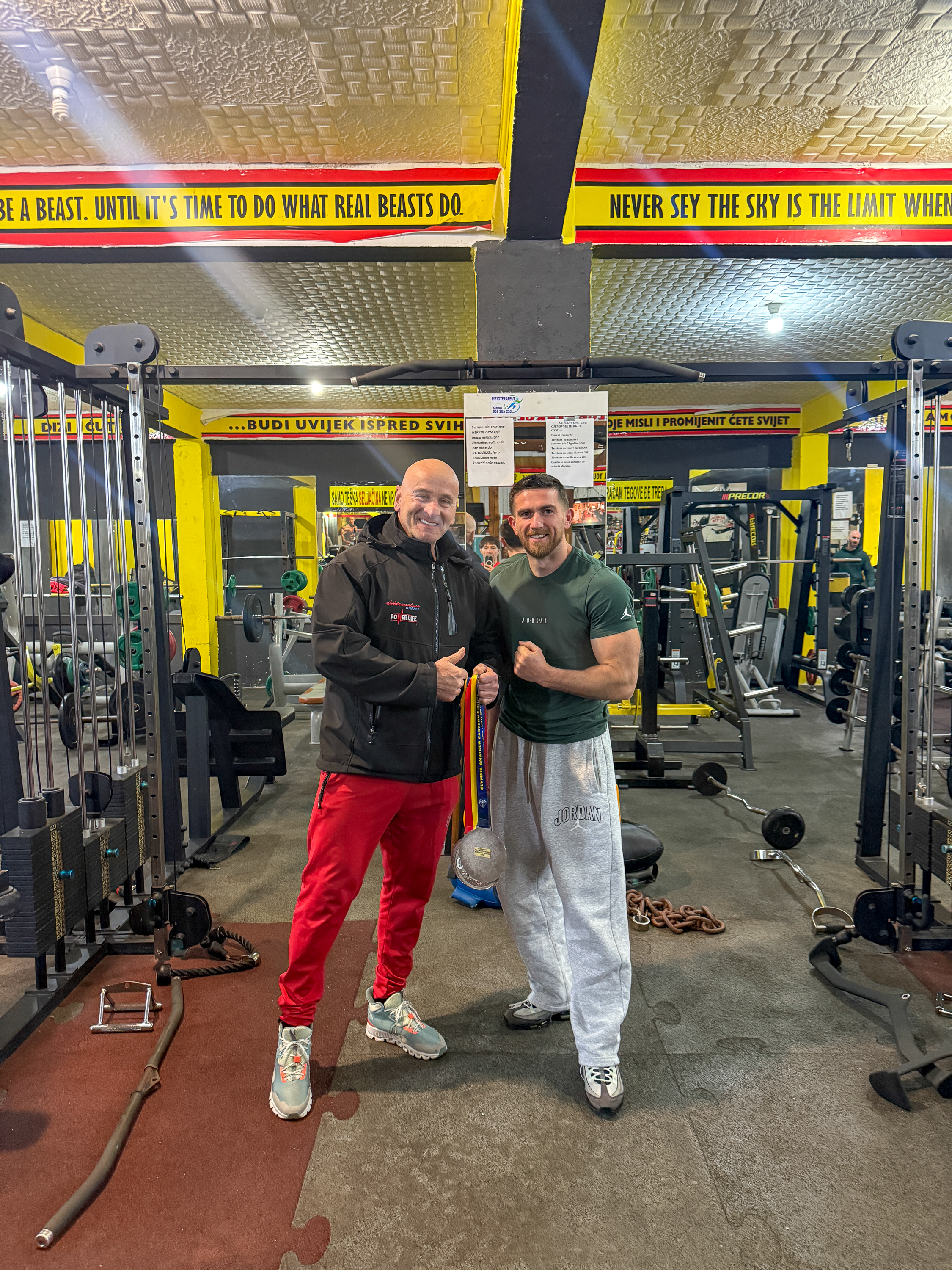 Then trained at Herkul Gym. Owner Saša let me train for free again. Lovely man. We talked despite the language barrier. He showed me his three Olympia medals, I asked to take a photo of them and he insisted I wear them. Then he took me to the main floor and took a photo of me wearing them. I asked for a photo together too. Sweet guy.