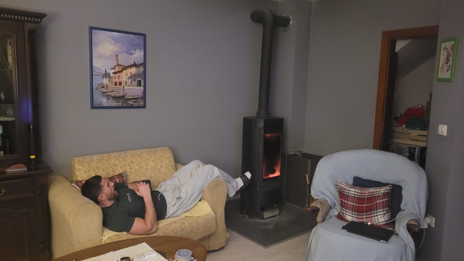 Sat down by the fireplace at Luka’s. Wood crackling, TV on, winding down. I like these nights where we come back after a long day, fireplace going, just me and Luka talking. Then went to sleep.