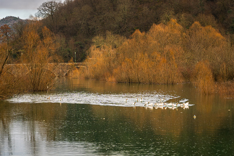 Drove to Rijeka Crnojevića with Luka and Leno. First stop was down by the lake near Hotel S Family Jovićević. Experimented with long exposure for silky water. ISO 50, f/11, around 0.4 to 0.5 seconds on the tripod. Some clipping on the white house and sky but exposed for the water which was the subject. Also shot handheld at faster shutter speeds for textured water.